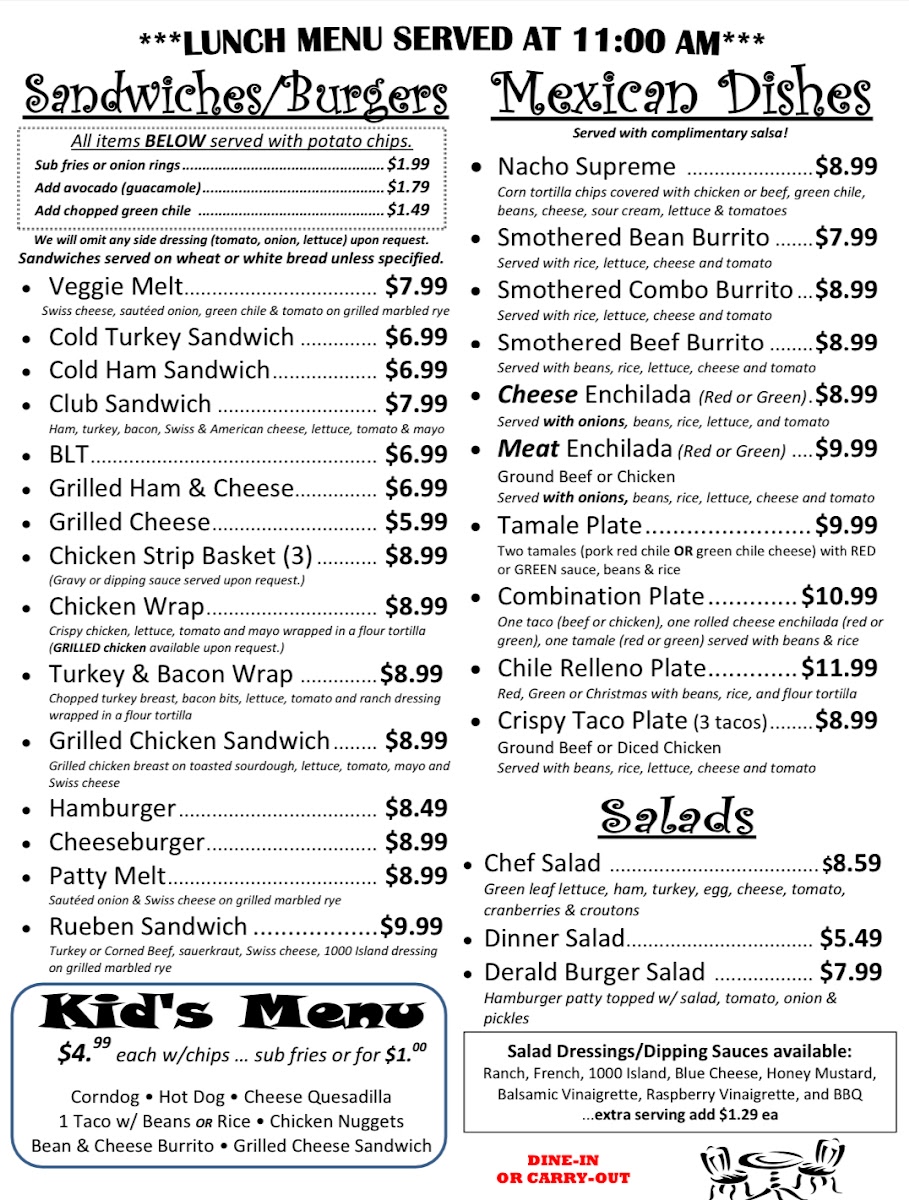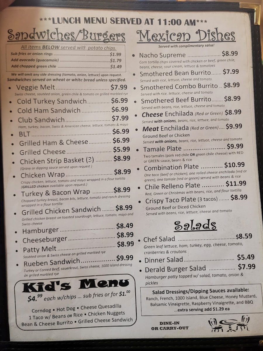 If you’re leaning toward something lighter, the Salads-including Chef Salad, Dinner Salad, and Derald Burger Salad-add balance to the menu. Breakfast lovers are covered with items like the Mcwee Sandwich, while weekends bring extra comfort with the Chicken Fried Steak Breakfast on Saturdays and Sundays. For lunch, the menu expands with filling plates such as Turkey & Bacon Wrap, Rueben Sandwich, Tamale Plate, and Chile Relleno Plate, reflecting a blend of diner staples and regional favorites.