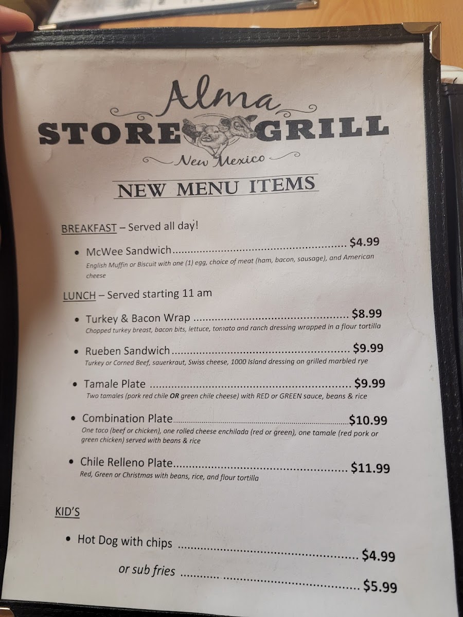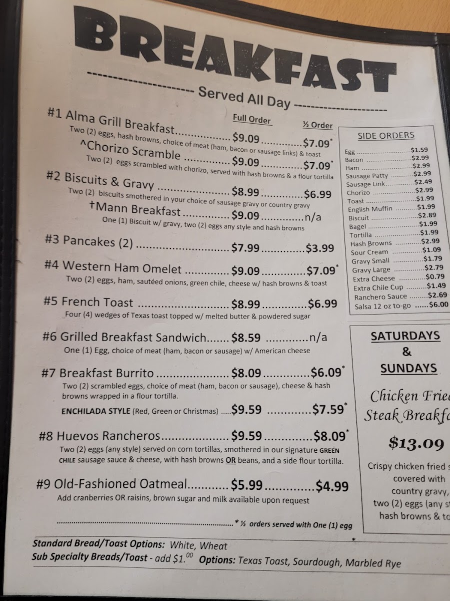 From a reviewer’s perspective, the menu at Alma Grill feels like a comforting snapshot of classic American diner food with a Southwestern soul, and it wraps up the dining experience on a satisfying note. The Sandwiches/Burgers section is simple but reliable, featuring familiar choices like Veggie Melt, Cold Turkey Sandwich, Cold Ham Sandwich, Club Sandwich, and BLT, all of which suggest hearty portions and straightforward flavors. For families, the Kid’s Menu stands out with approachable options such as Corndog, Hot Dog, Cheese Quesadilla, 1 Taco w/ Beans or Rice, and Bean & Cheese Burrito, making it easy for younger diners to find something they’ll enjoy.