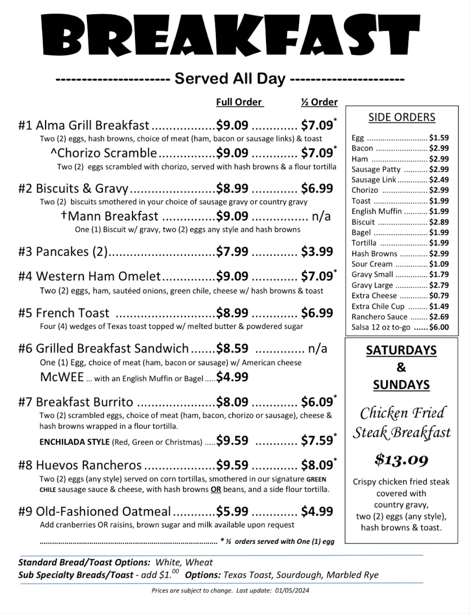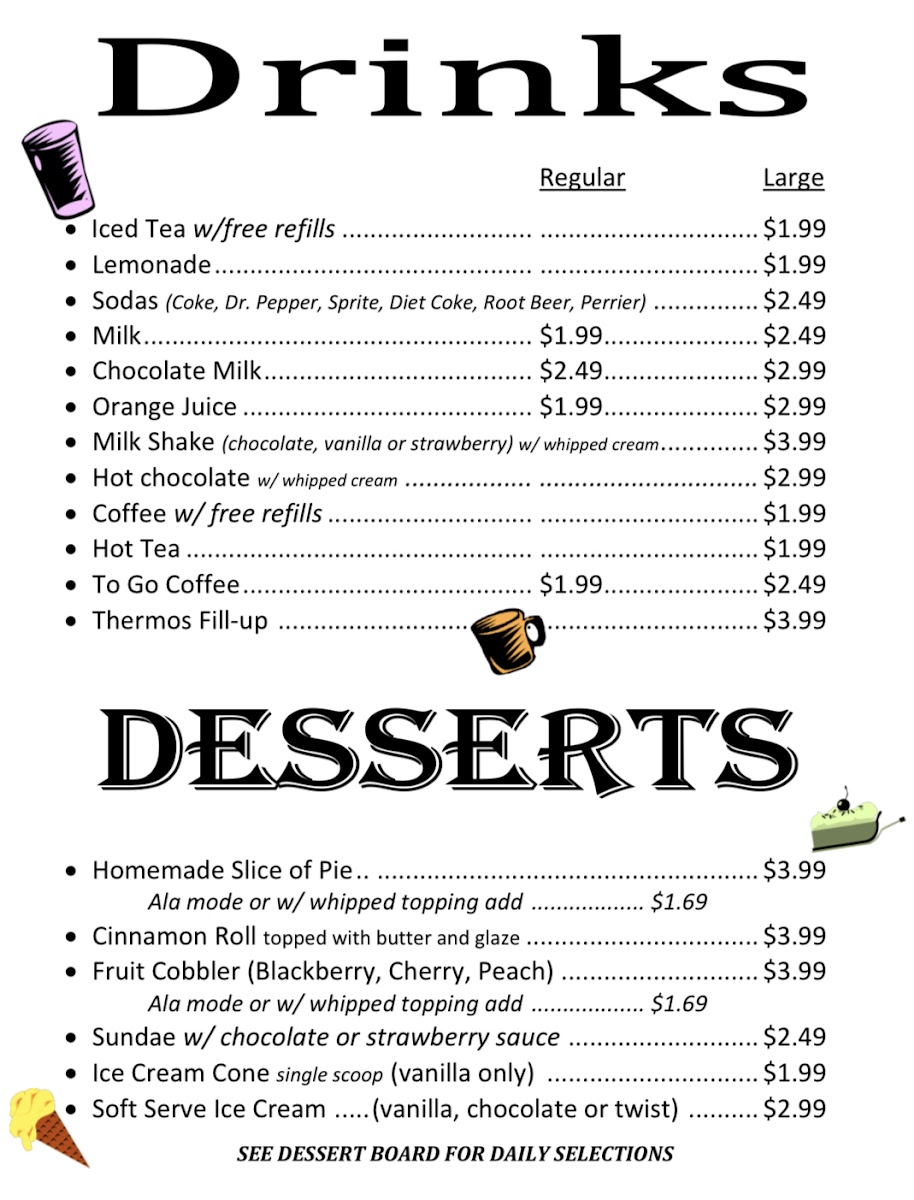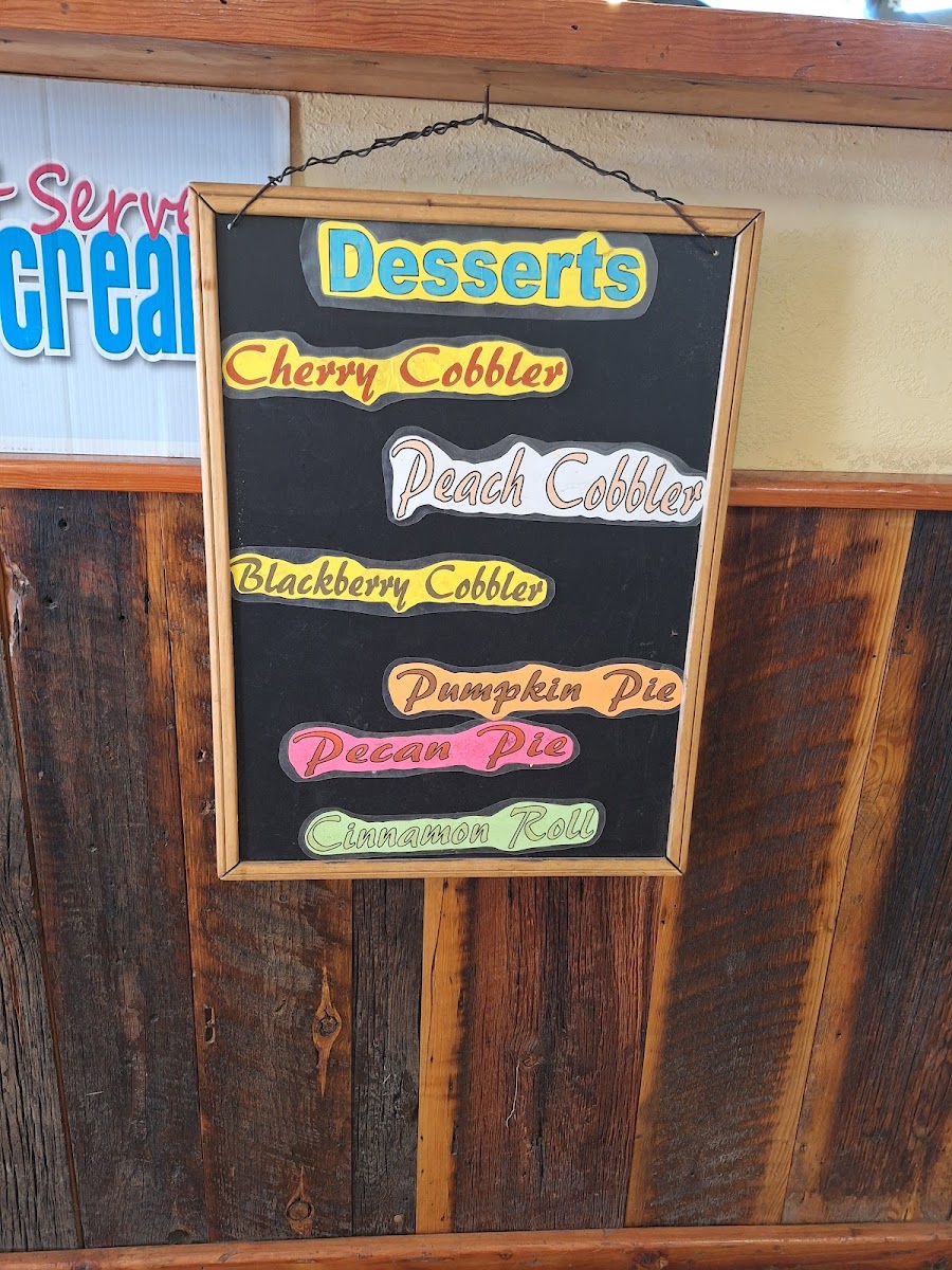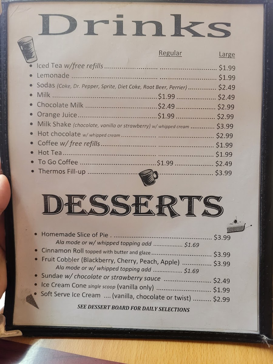 Side options like Bacon, Sausage Patty, Sausage Link, Chorizo, and Toast allow guests to customize meals, while the drinks menu-Iced Tea w/ Free Refills, Lemonade, Sodas, Chocolate Milk, and Orange Juice-keeps things classic and refreshing. To finish on a sweet note, desserts such as Homemade Slice of Pie, Cinnamon Roll, Fruit Cobbler, Sundae w/ Chocolate or Strawberry Sauce, and Ice Cream Cone provide a nostalgic ending. Finally, hearty extras like Nacho Supreme, Smothered Bean Burrito, Smothered Combo Burrito, Cheese Enchilada, and Meat Enchilada reinforce the restaurant’s comfort-food identity. Overall, the menu comes together as a well-rounded, no-frills offering that prioritizes familiarity, generosity, and the kind of food that keeps locals coming back.